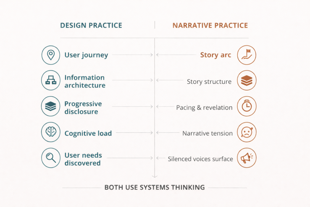 Recognizing this parallel helps clarify what good design and good writing actually require. Strong UX strategy asks: what story does this product tell about what’s possible? Where does confusion arise because the structure doesn’t support the journey being asked of users? Strong narrative work asks parallel questions: what narrative structure would help readers hold this complexity emotionally? Where does friction exist not because readers need to sit with difficulty, but because the right pathways haven’t been built?